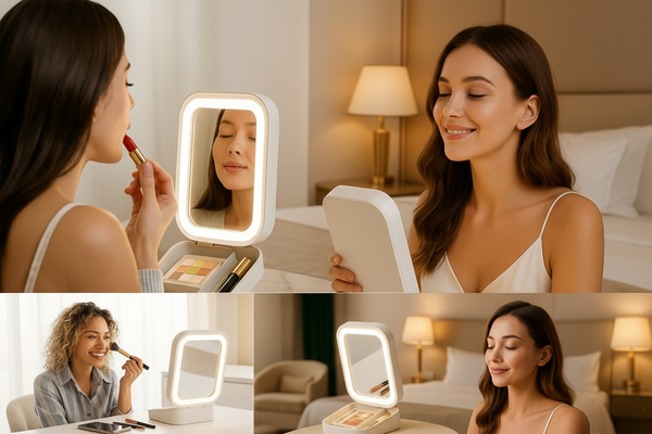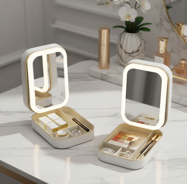Open Vanity Glow and exhale. The soft, studio-clear lighting reveals true color, while curated compartments keep lipstick, liner, and jewelry exactly where you expect. Airport lounge, boutique hotel, tiny desk every space becomes your beauty station.